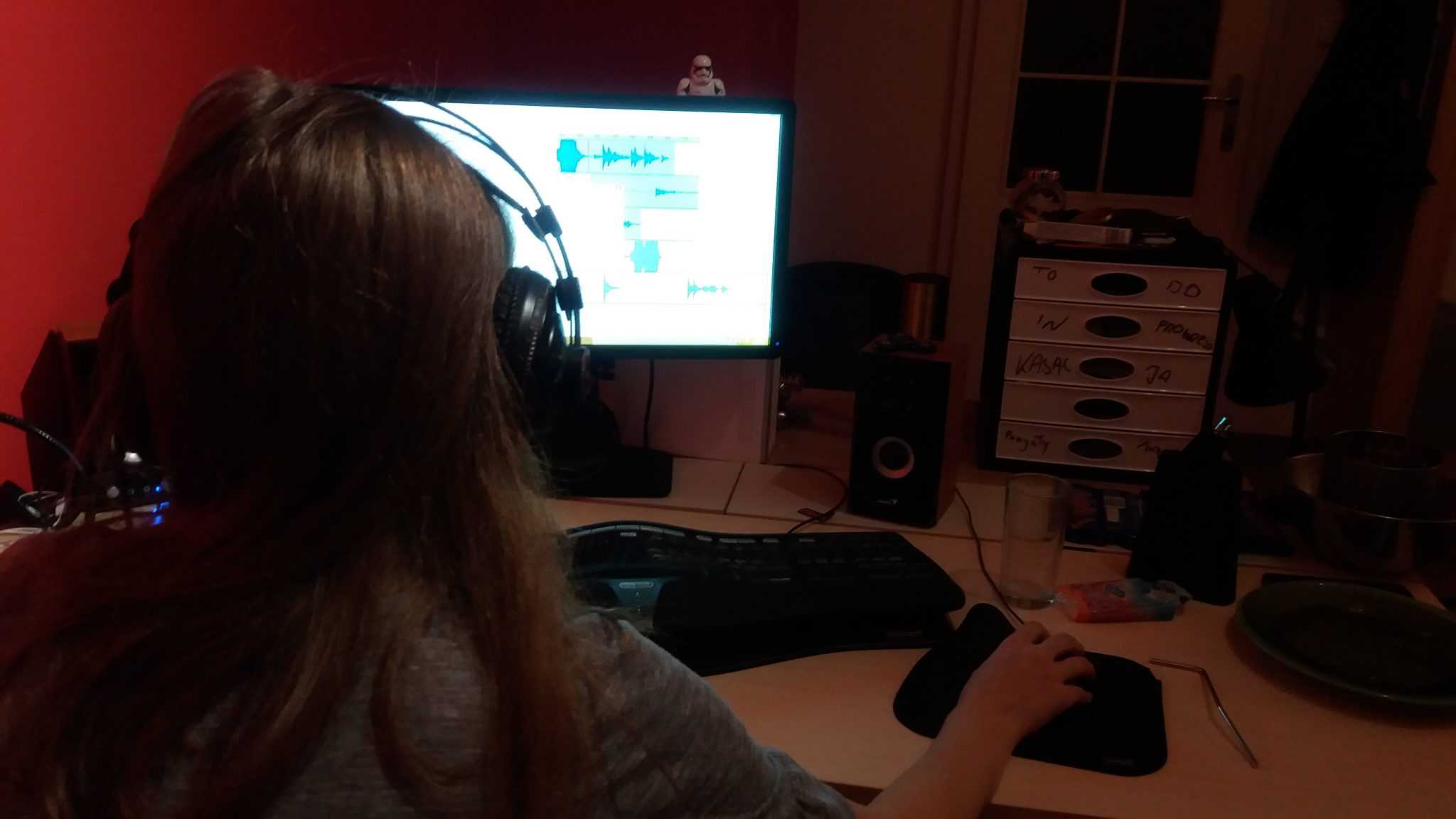 Potem przyszła kolej na tworzenie muzyki (przeze mnie), grafik (Kamila) i wspólnie – efektów dźwiękowych. Strasznie żałuję, że nie nagraliśmy tego przedsięwzięcia zza kulis. Pewnie teraz nie uwierzycie, że odgłos kraksy pociągu, to tak na prawdę kombinacja upadającej blachy (takiej z piekarnika), sztućców w metalowym pojemniku i mosiężnych dzwonków. Jedyne co się uchowało to zdjęcie Kamili miksującej już nagrane dźwięki.